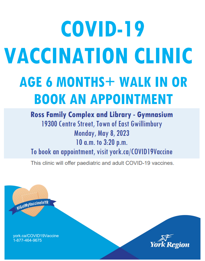 Come check out the Covid-19 pop-up Vaccination Clinic at the Ross Family Complex and Library - in the Gymnasium. Walk ins are available. If you would like to book an appointment, please visit: york.ca/COVID19Vaccine