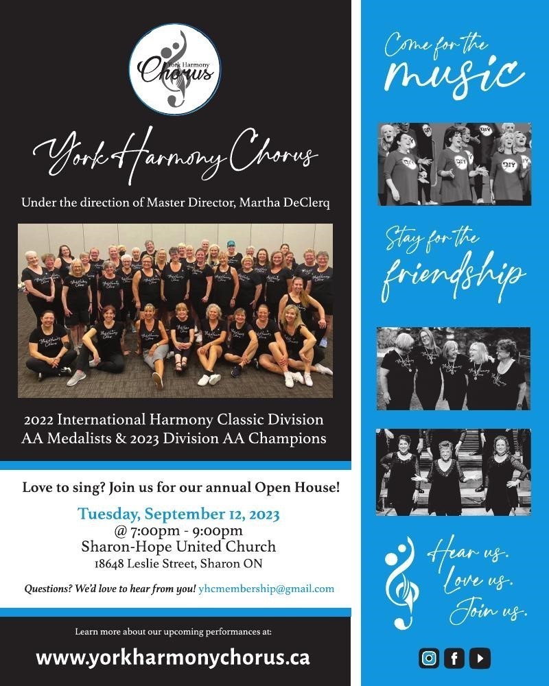 Visit us at our Sharon Hope United Church rehearsal space from 7 - 10 p.m. on Tuesday, September 12.