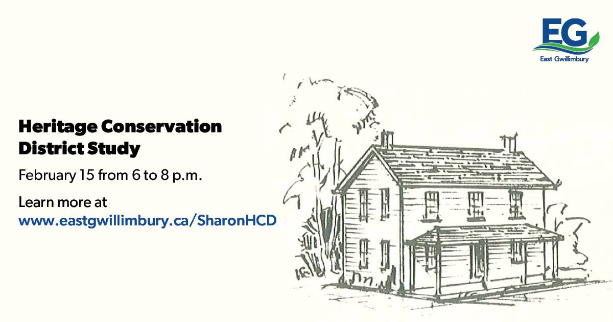 Are you interested in learning about the history of the Sharon Village area? Share your thought's at EG's second Public Information Session for the Sharon Heritage Conservation District Study on Thursday, February 15 from 6 to 8 p.m. at the EG Civic Centre (19000 Leslie St).