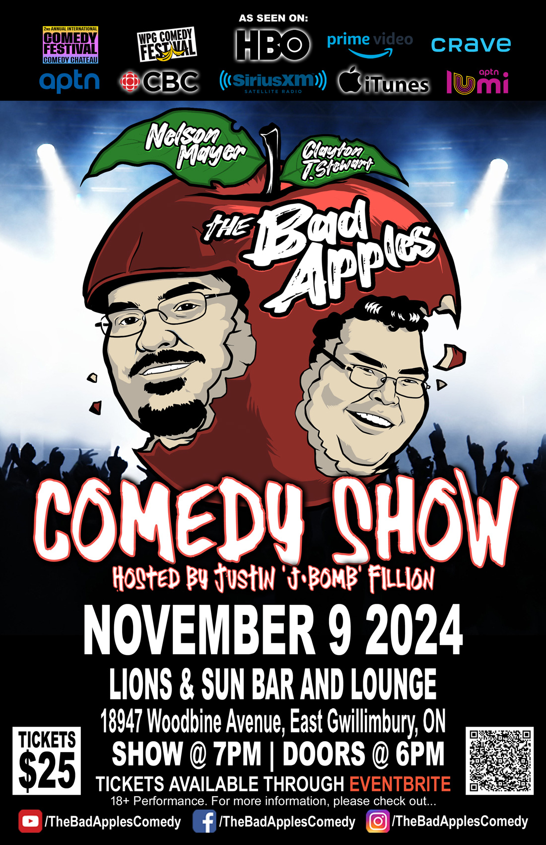 The Bad Apples, featuring the comedic talents of Nelson Mayer and Clayton T. Stewart. With Special Guest Host Justin “J-Bomb” Fillion!