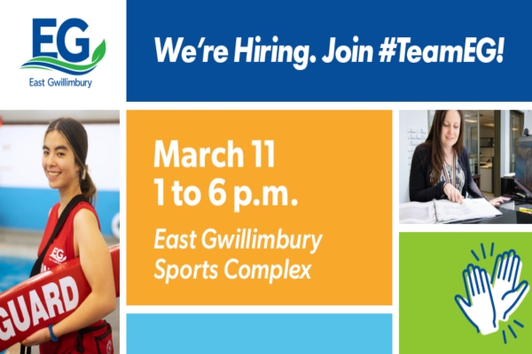 We're hosting a job fair on March 11 from 1 to 6 p.m. at the EG Sports Complex. Stop by to learn more about upcoming opportunities, including positions at the Health and Active Living Plaza!